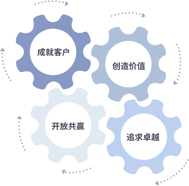 成就客户是一切决策的出发点,,,创造价值是衡量所有工作的标准,,,追求卓越是我们做事做人的态度,,开放共赢是我们的格局也是最终的结果。。。价值观的齿轮环环相扣,,,,推动着组织里的每个人不断向前。。