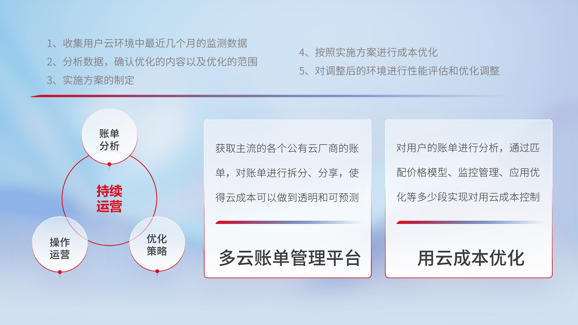 通过多云纳管,,以统一的资源数据模型把客户的云资源进行抽象和封装,,,进而实现对多云资源的统一操作,,,保障云资源管理的可靠性、、稳定性与可用性。。量身定制化运维内容,,配置、、开发运维、、、、补丁管理、、、、备份、、监控、、认证和访问管理、、、审计和日常巡检等,,保障在用云过程中的可靠度,,,,稳定度以及高可用率。。