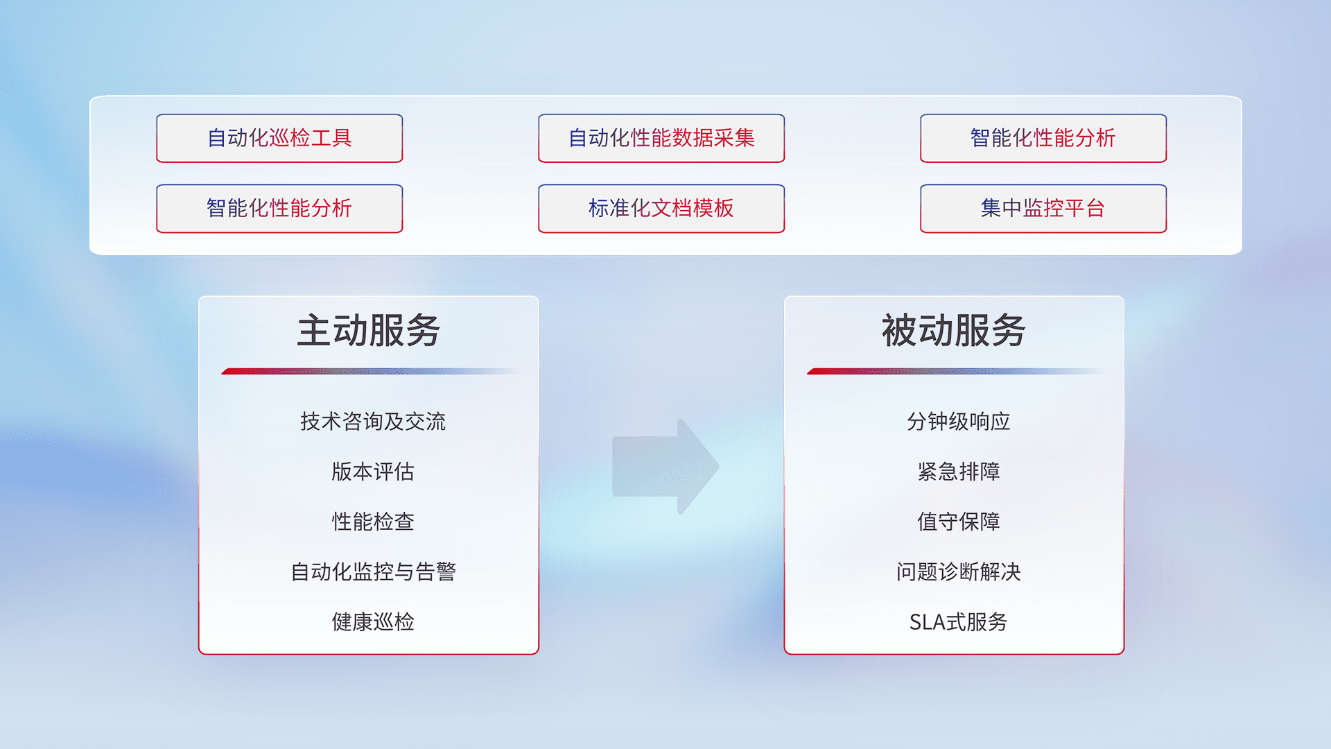 智能化工具和标准化文档,,保障服务质量,,,,提供主动服务(包含技术咨询、、、、版本评估、、、性能检查、、自动化监控与告警、、健康巡检)和被动服务包含(分钟级响应、、紧急排障、、、、值守保障、、问题诊断解决、、SLA服务)。。。。