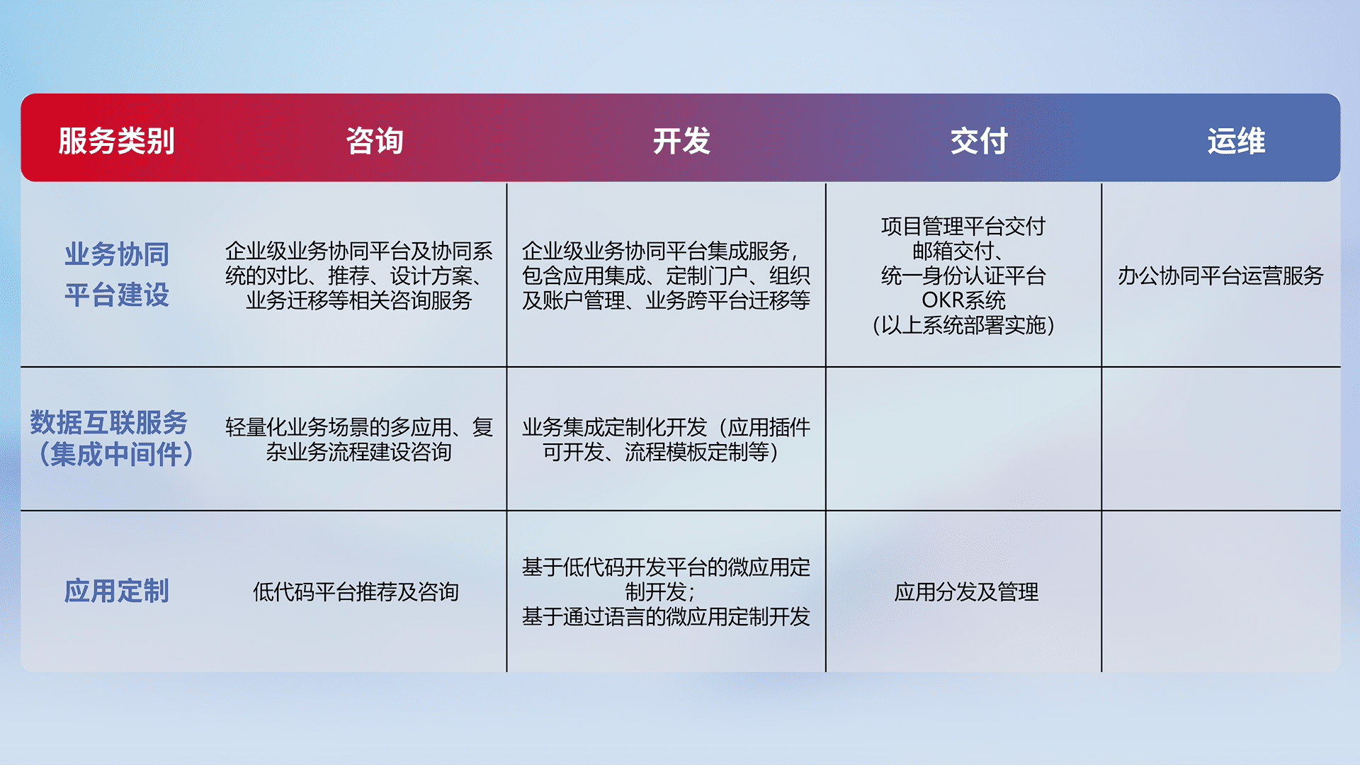 针对钉钉、、、企微、、、IDaas等平台级产品提供产品的规划、、、方案、、交付、、定制化开发等服务,,实现如统一协同办公、、、、智能客户服务、、、混合会议管理、、、智能数据查询、、、、等业务场景,,,,实现数字化转型。。